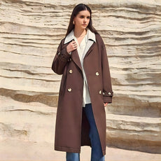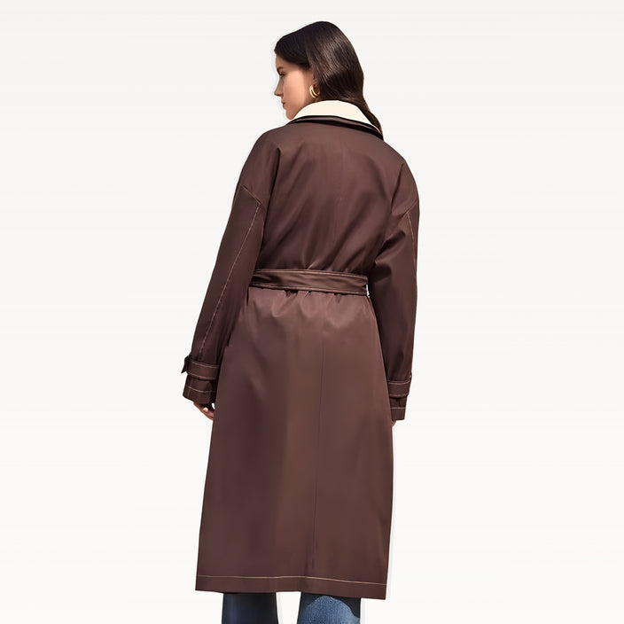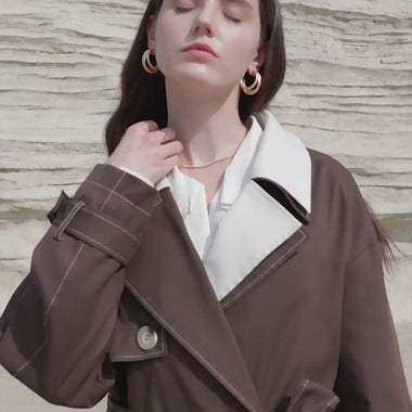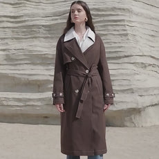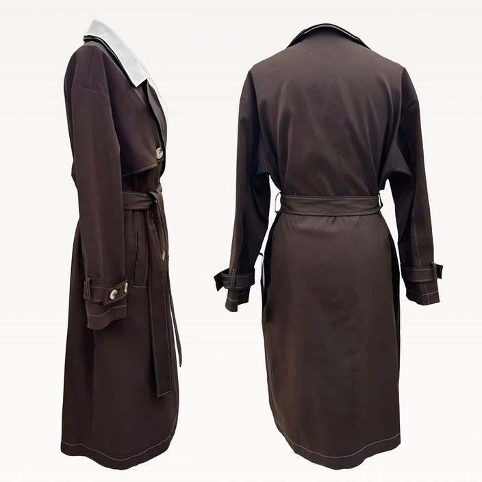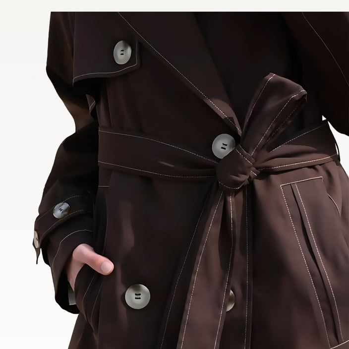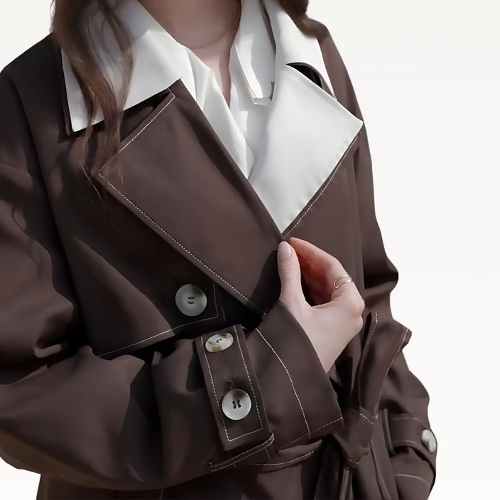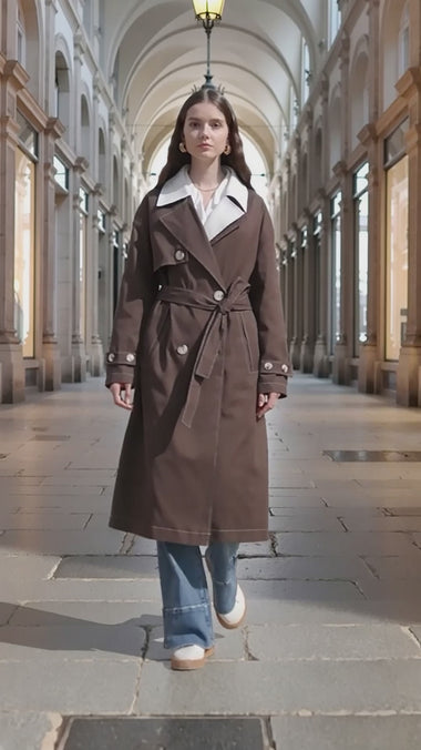 Tailored long trench with a turn-down collar and clean, structured lines. Designed with double-button adjustable cuffs and contrast stitch detailing for a refined, premium finish. Features a detachable belt so you can choose structure or flow depending on your day. Made in a breathable polyester blend with an anti-wrinkle, quick-dry finish, ideal for transitional weather.
