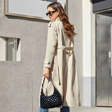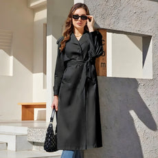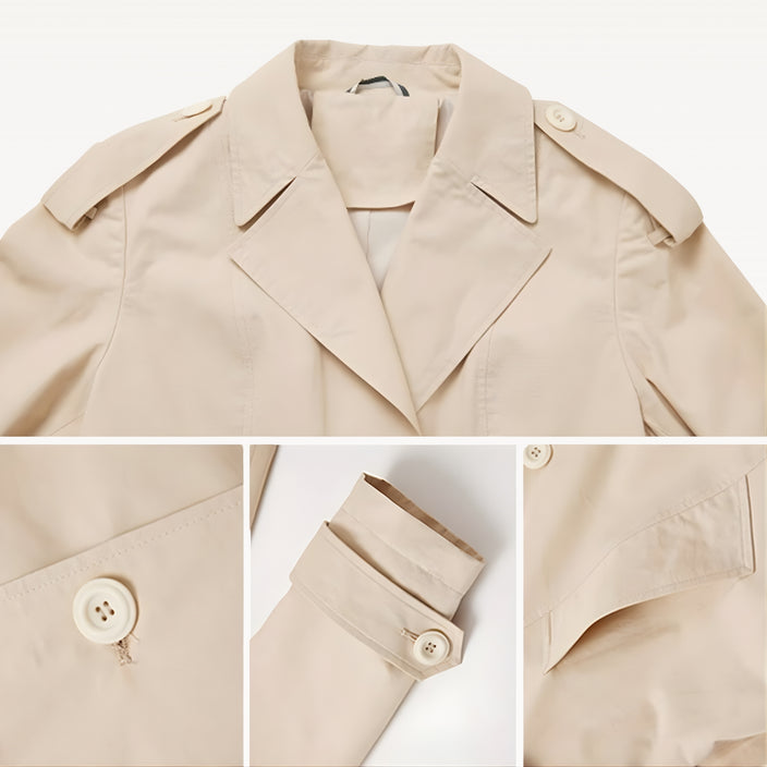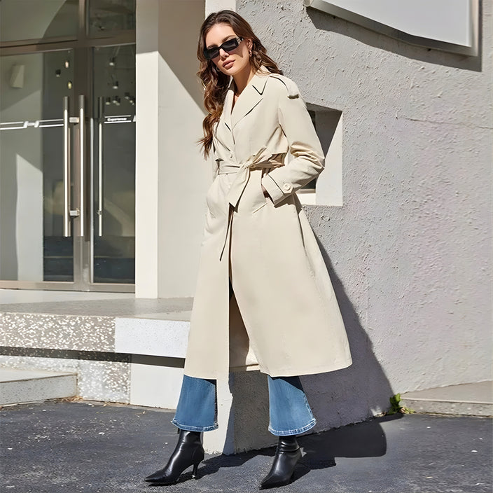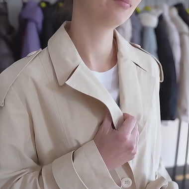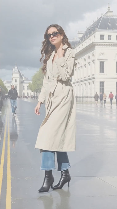 Long, structured trench with a soft straight shoulder line for a clean, modern profile. Designed with an adjustable belt to shape or relax the silhouette depending on your day. Made from a water-resistant polyester shell ideal for light rain and daily wear. Features a classic pointed collar with a single-breasted closure, plus buttoned cuffs and shoulder epaulettes for a refined, tailored finish.