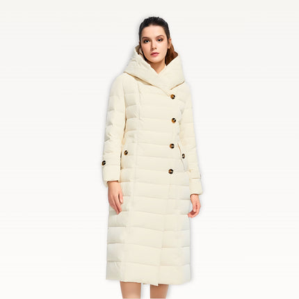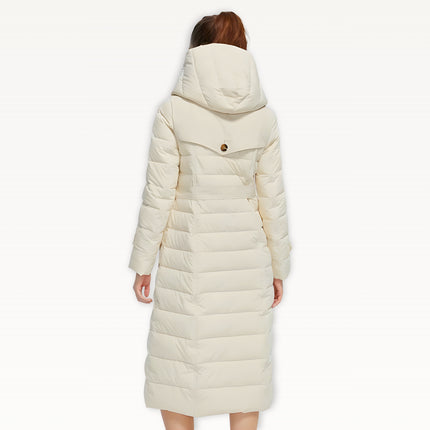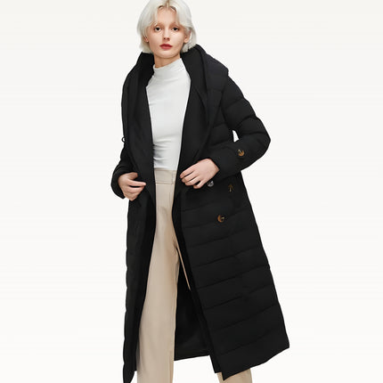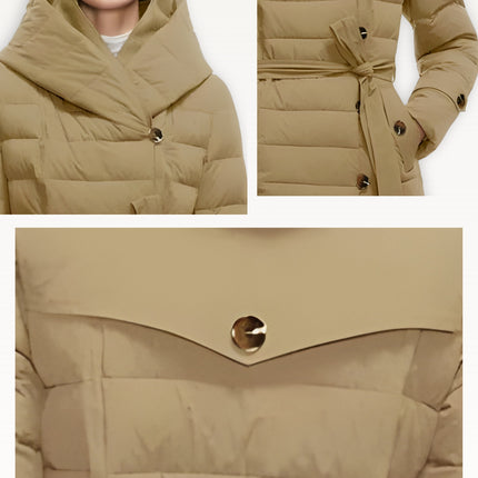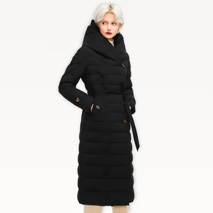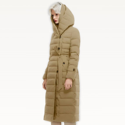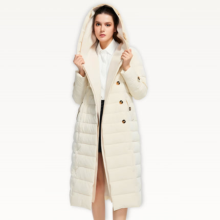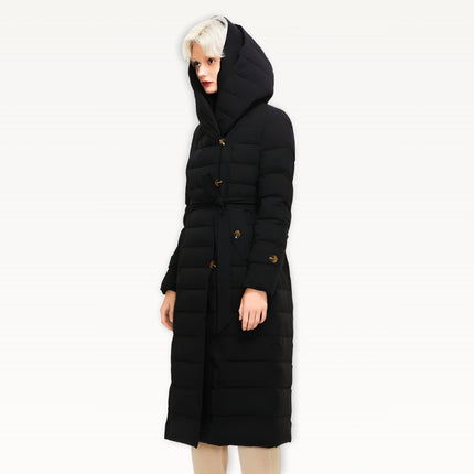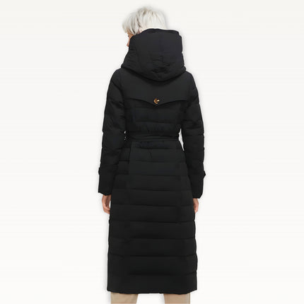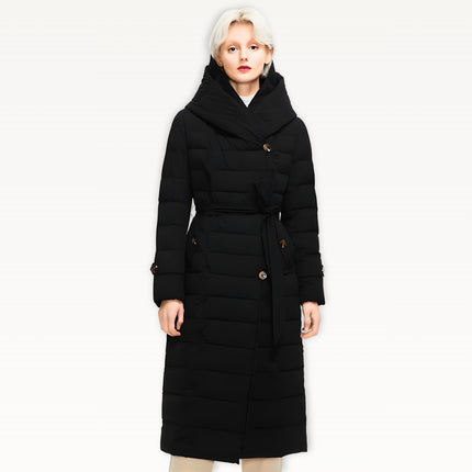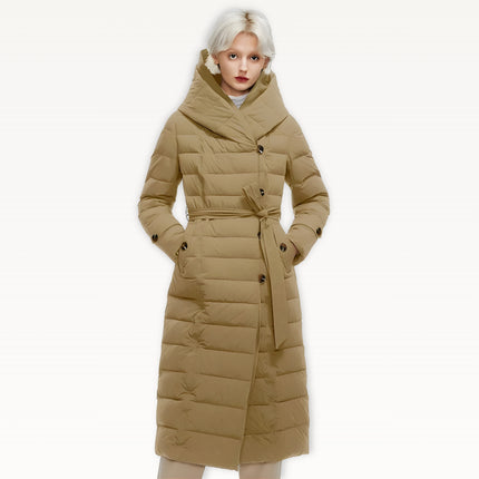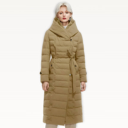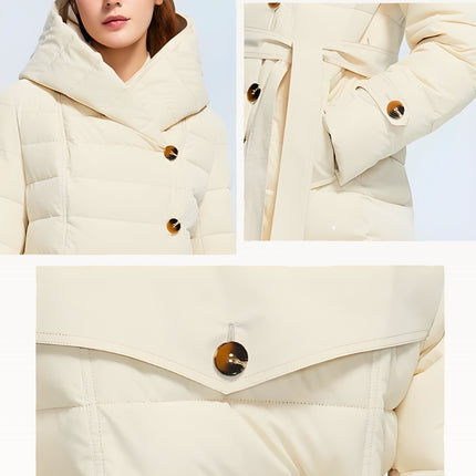 Two-layer thickened fabric provides extra insulation against harsh winter conditions. Built with a waterproof woven shell filled with premium duck down for serious warmth. Features an oversized wrap hood for full neck and head coverage, plus a detachable belt to create a defined, elegant silhouette. Designed with a windproof, breathable construction, deep side pockets with luxe button details, and a longline cut for maximum winter protection.
