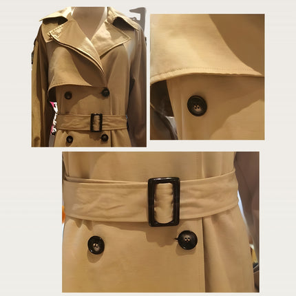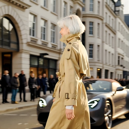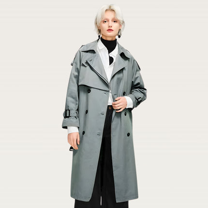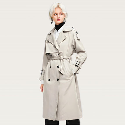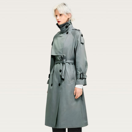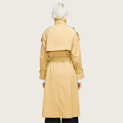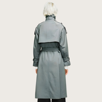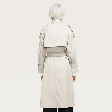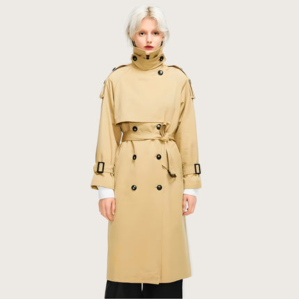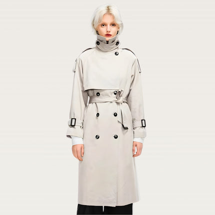 Oversized longline trench with a structured silhouette for an elevated everyday look. Features a convertible collar that switches from open lapel to high-neck wrap, plus a removable high-neck panel for versatile styling. Built with a windproof, water-resistant polyester shell to handle unpredictable weather. Double-breasted front with epaulette shoulders adds a refined finish, while the detachable waist-cinching belt lets you shape the silhouette your way.